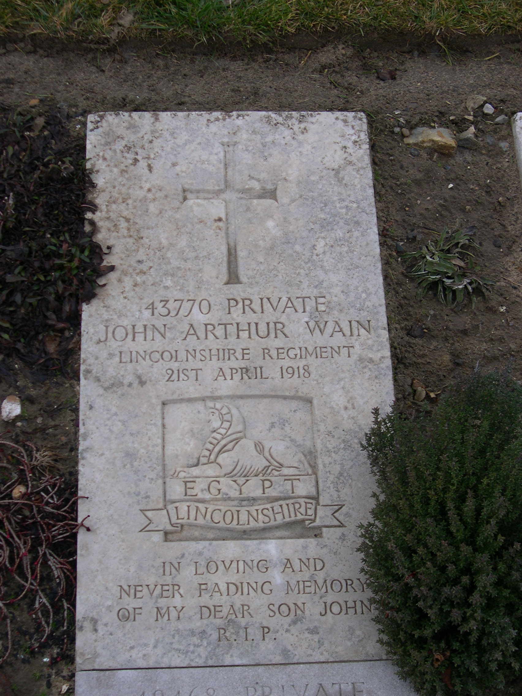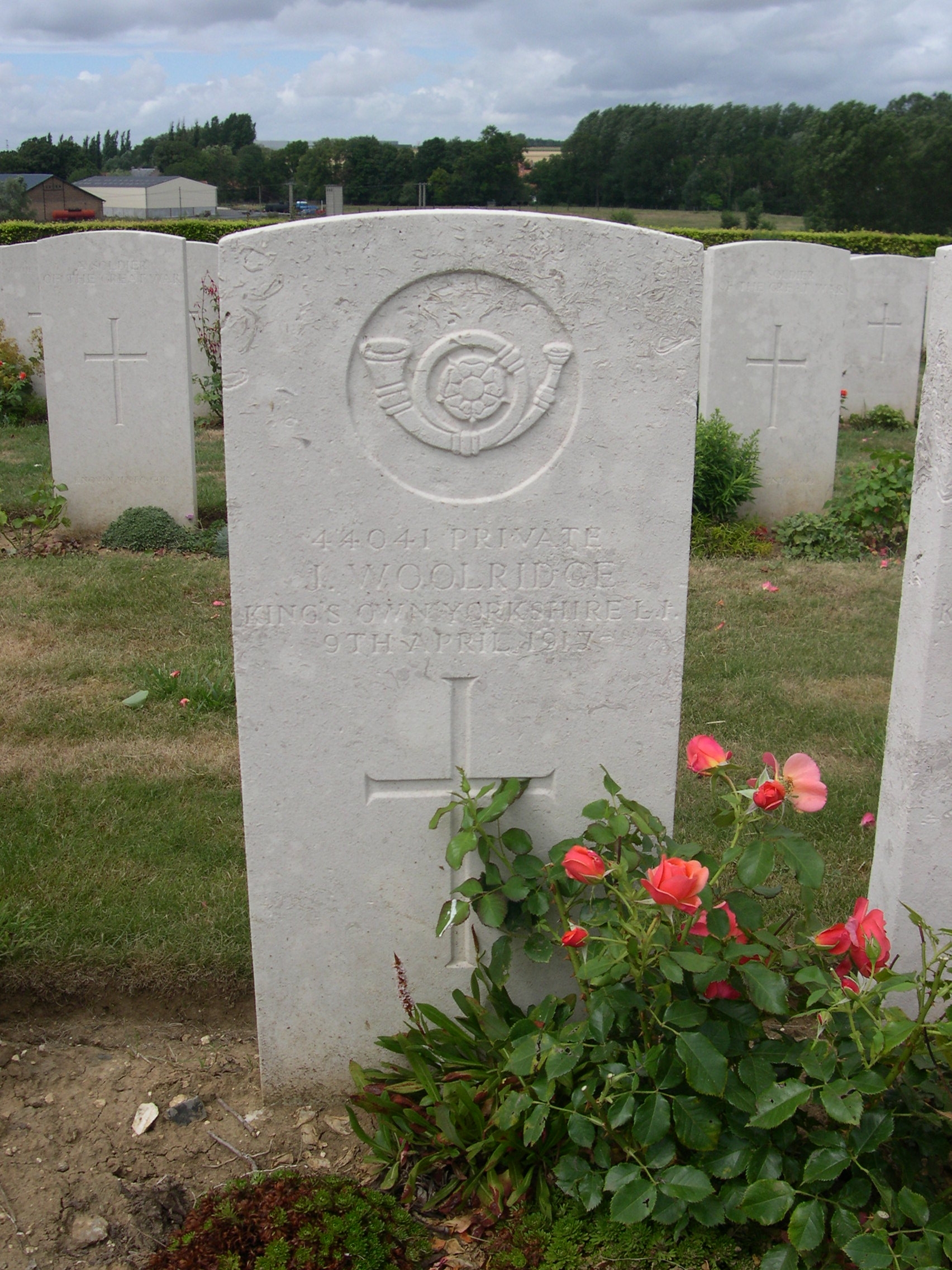 John Woolridge was born in Aldershot in 1884, the son of Lewis Woolridge and Emma Fanny Woolridge (née Friday) who were married on 3rd October 1883 at the Church of St. Michael the Archangel, Aldershot, Hampshire. At birth he was registered as 'Johnny Woolridge' but all other official documents use the name 'John Woolridge'. John's father was a Driver in the Royal Artillery and in 1891 the Woolridge family was living at Shorncliffe Camp, Cheriton, Kent. John had four sisters Winifred, Aileen, Dorothy and Amy. By 1901 John's father had left the Army and was working on a farm and the family was living in Upper Street, Okeford Fitzpaine, Dorset. John, now aged 17, was a butter roller at the Hillview Dairies in Okeford Fitzpaine. On 11th April 1907 John married Rose Upshall at St. Andrew's Church, Okeford Fitzpaine, and in 1911 John and Rose were living in Okeford Fitzpaine with Rose's widowed father, a farm labourer. John was now working as a blender at Hillview Dairies and Rose was a glove maker. Rose's father died in the early summer of 1914 and when John enlisted at Sturminster Newton in late 1915 Rose moved to 111 Queen's Road, Loughborough. Rose's sister Isabella and her husband Henry Short ran a lodging house at 35 The Rushes and Rose's brother Charles also worked there as a groom. John initially joined the Royal Artillery as Private 164023 but at some point transferred to the 9th (Service) Battalion of the King's Own Yorkshire Light Infantry (KOYLI) as Private 44041. His date of transfer is unknown as his service record has not survived. His date of entry into France is also unknown but it was no earlier than 1916 as he did not qualify for the 1914/15 Star Medal. In 1916 the 9th Battalion of KOYLI was in action in the Battles of The Somme, including the Battle of Morval in which the Division captured Geudecourt. According to the battalion's war diary substantial reinforcements of ordinary ranks joined the battalion in late September and late December 1916 and in January 1917. John is likely to have been in one of these groups. In early October 1916 the battalion was in training at Buigny l'Abbé and Chocques before going into the trenches in the Cambrin Sector where they were heavily bombarded by the enemy. They also provided assistance to Royal Engineers tunnelling parties. Respite from the trenches was in Annequin and Béthune. On 6th December the battalion marched to billets in Philosophe and worked on dugouts before going into the support trenches in the Hohenzollern Sector. On 28th December the battalion marched to Noeux-les-Mines. All of January 1917 was spent training: route marches, tactical exercises and musketry. At the end of the month the battalion entrained for Esquelbecq and marched to Ledringhem where training continued and there were also working parties with the Royal Engineers on the railway west of Poperinghe. In mid-February the battalion moved to Annequin and went back into the trenches in the Cambrin Sector. In early March the battalion marched via Béthune, Esqueldecq and Séricourt to Lucheux where they spent nine days on attack practice. Further moves followed to Berles-au-Bois, Adinfer and Bosieux-au-Mont. On 9th April 1917 the battalion made an assault on the Hindenburg Line which failed owing to misplaced artillery preparation. Eight officers and 176 ordinary ranks were killed, including John Woolridge. John was 33 when he died. He was buried at Wancourt British Cemetery, Grave V. G. 26 and is commemorated on the Okeford Fitzpaine War Memorial, Dorset. |