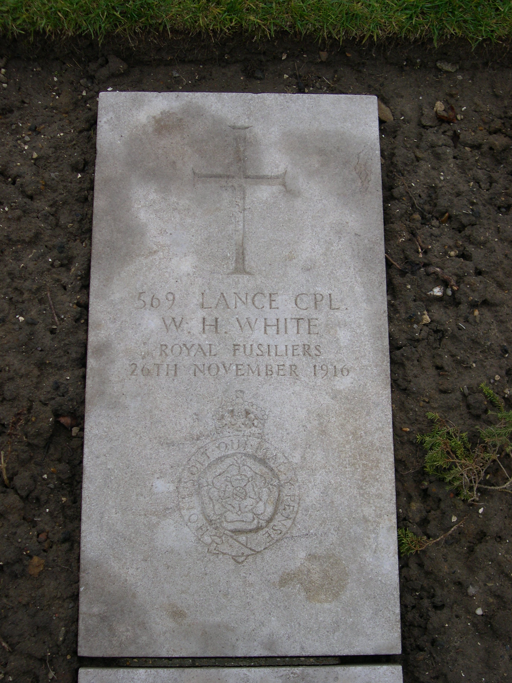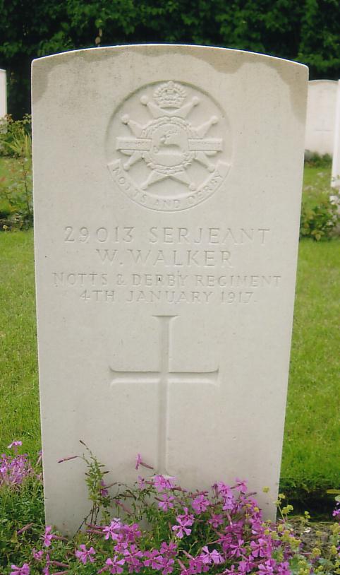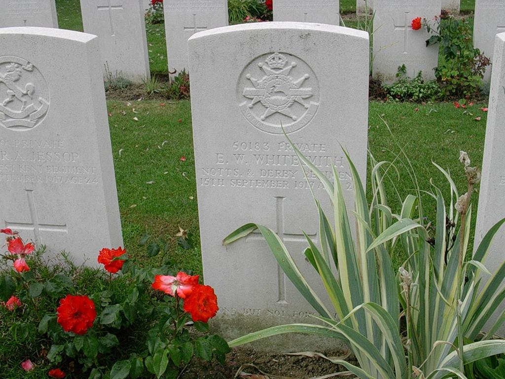In 1891 Ernest was living in the household of widowed Jane Whitesmith (probably his grandmother) and her children John, Dinah and Henry at 1 Court E, Baxtergate, Loughborough. By 1901 Dinah Whitesmith, a hosiery worker, was married to John Cresswell and living at 2 Cemetery Place, Loughborough. Ernest was listed on the 1901 census in the Cresswell household as 'Ernest Cresswell', the son of John and Dinah Cresswell. In 1908 Ernest, calling himself 'William Ernest Whitesmith' married Agnes Mary Hunter. According to the 1911 census Agnes Whitesmith was living at 52 King Street, Loughborough. With her were her daughter Doris and her sister-in-law Annie Whitesmith who was probably a sister or half-sister of Ernest. Ernest's whereabouts and occupation on the 1911 census night are unrecorded. Ernest and Agnes had four children Doris, William, Norman and Vera, but only Doris survived infancy. Ernest enlisted in the late summer of 1915, but his exact date of enlistment is unknown as his service papers have not survived. He joined the newly formed 17th (Service) Battalion (Welbeck Rangers) of the Sherwood Foresters (Notts & Derby Regiment) as Private 50183. In October 1915 the battalion moved to Aldershot under orders of the 117th Brigade in the Army's 39th Division and then in November 1915 to Witley Camp, Surrey. On 6th March 1916 the battalion entrained at Milford for Southampton Docks and embarked on three transports: the RMS Connaught, the SS Archangel and SS Inventor. Having disembarked at Le Havre on the following day the battalion encamped at Bleville. On 8th March they entrained at Le Havre for Steenbecque. On 13th and 14th March they marched via Estaires to Sailly and went into Divisional reserve in billets near Cul de Sac Farm. After five days of inspections the battalion marched to a new billeting area at Estaires. Two companies then went to the trenches for three days of instruction by the 2nd Battalion of the Middlesex Regiment. On 22nd March the other two companies went to the trenches for instruction by the 2nd Battalion of the Devonshire Regiment. From 28th March until 5th April the battalion was at Busnettes for further inspections before marching via Béthune to Annequin. On 7th April two companies of the battalion went to hold a trench on the Auchy line, supervised by the 20th Battalion of the Royal Fusiliers. The other two companies relieved them on the following day. From 10th-14th April the battalion was in the trenches in the Auchy right sub-sector and was heavily bombarded by the enemy. They then moved to billets in Béthune before going into Divisional reserve at Hingette two days later. On 23rd April they marched to Le Touret and went into the front line at Festubert until 1st May. During May the battalion worked on the front lines at Festubert, Gorre and Givenchy, with breaks at Festubert and Hingette. June began with training near Gorre and on 11th June the battalion began a trench tour at Festubert which lasted for an extraordinary thirty-four days, included the opening of the Somme Offensive, and caused 130 casualties. On 14th July the battalion moved into Brigade support at Richebourg St. Vaast and on 26th July into Brigade support in the Givenchy sector. A raid on the enemy's trenches on 1st August cost the battalion another 69 casualties. Much of the rest of August was spent in training at Essars and Orlencourt. Between 24th and 31st August the battalion moved by train and route march via Bouquemaison, Doullens, Vauchelles-les-Authie and Bertrancourt to Vitermont near Englebelmer and was then in position to take part in the 2nd Somme Offensive. On 2nd September the battalion went into the trenches near Beaumont-Hamel and on 3rd went into the attack until ordered to withdraw to the trenches and then to Mailly-Maillet Wood. The battalion suffered 454 casualties. The battalion was reinforced and returned to the trenches on 12th September. After a break at Beaussart a further trench tour in the Serre sector began on 20th September, followed by a break in Bertrancourt and Hedauville for inspections. The battalion returned to the trenches in the Thiepval sector on 4th October and were subjected to heavy enemy artillery shelling. On 8th October the enemy bombed the battalion's line but on the following day the battalion took part in a successful attack on the Schwaben Redoubt. Between 10th and 15th October the battalion was in huts in Martinsart Wood for training. They then returned to the Thiepval trenches for four days and suffered 62 casualties. During the remainder of October they completed two further trench tours in the area of Thiepval and the River Ancre and provided carrying parties to the front line from Authville before taking a break at Senlis. In early November the battalion completed two trench tours in the River Ancre sector and on 13th November took part in operations during which 700 prisoners were taken. After moving to Warloy and Gezincourt they entrained at Candas for St. Omer on 17th November and marched to Tentinghem. Between then and 21st December the battalion was attached to the 2nd Army Central School of Instruction for a programme of work. On 22nd December the battalion moved by train to Ypres and marched to the Canal Bank where they were in the trenches until 13th January 1917. Christmas Day 1916 was belatedly celebrated at C Camp, Voxvrie, Poperinghe, on 16th January 1917, followed by training and then a return to the trenches, this time at Kaaie, Ypres, on 25th January. Between 1st February and 11th April the battalion did seven trench tours in the Ypres area, with working parties in the front line, ten days training at Voxvrie and breaks at St. Lawrence and Montreal Camps. On 12th April they entrained at Poperinghe for Esquelbecq and marched to Bollezeele where training and attack practice took place until 27th April. The battalion then returned to Poperinghe to work on railway construction under the Royal Engineers until 14th May. On 15th