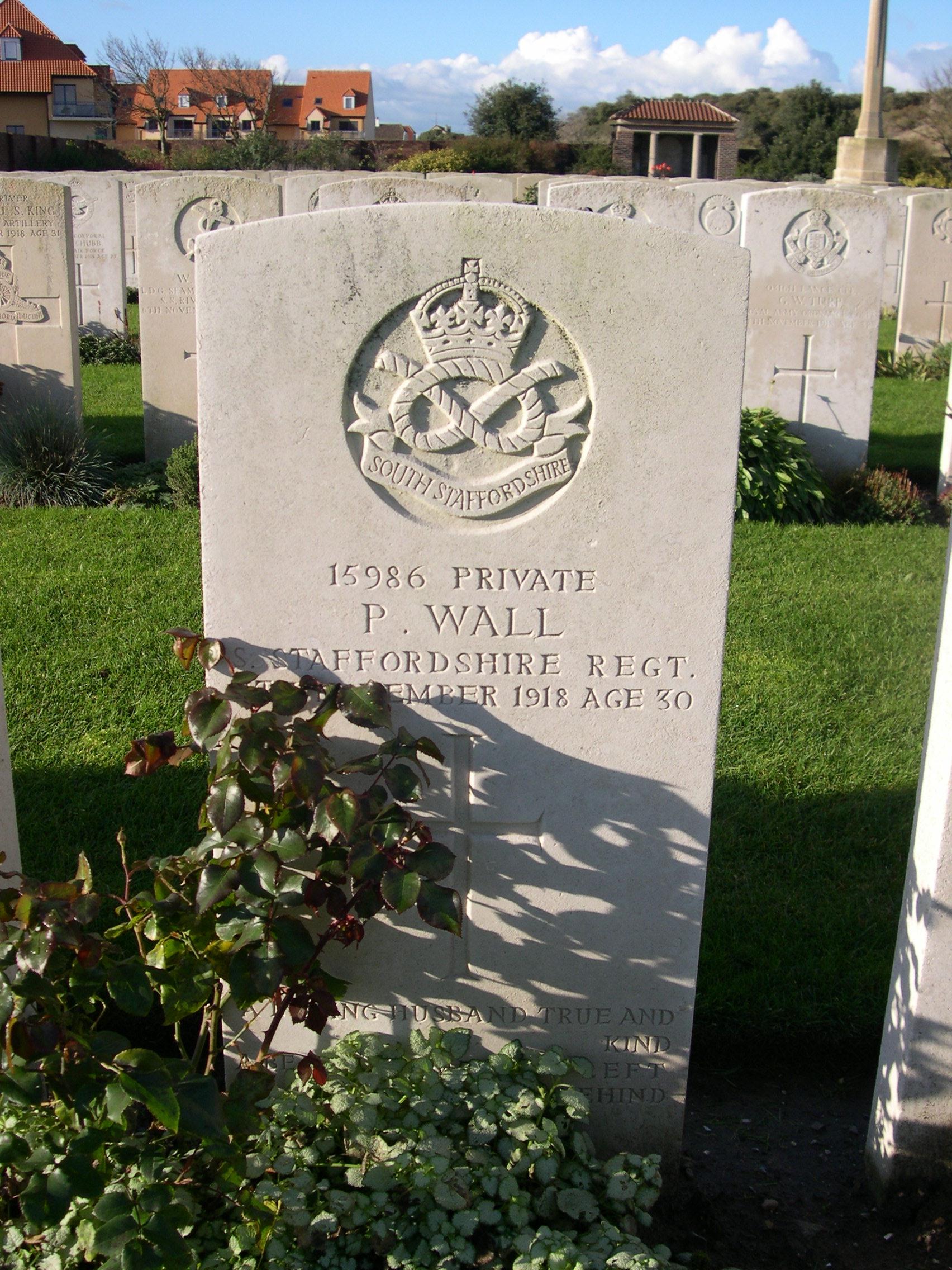 1/6th Bn, South Staffordshire Regiment. Died 8th November 1918, Aged 30. Buried Les Baraques Military Cemetery, Sangatte, Calais, VI. E. 8A.