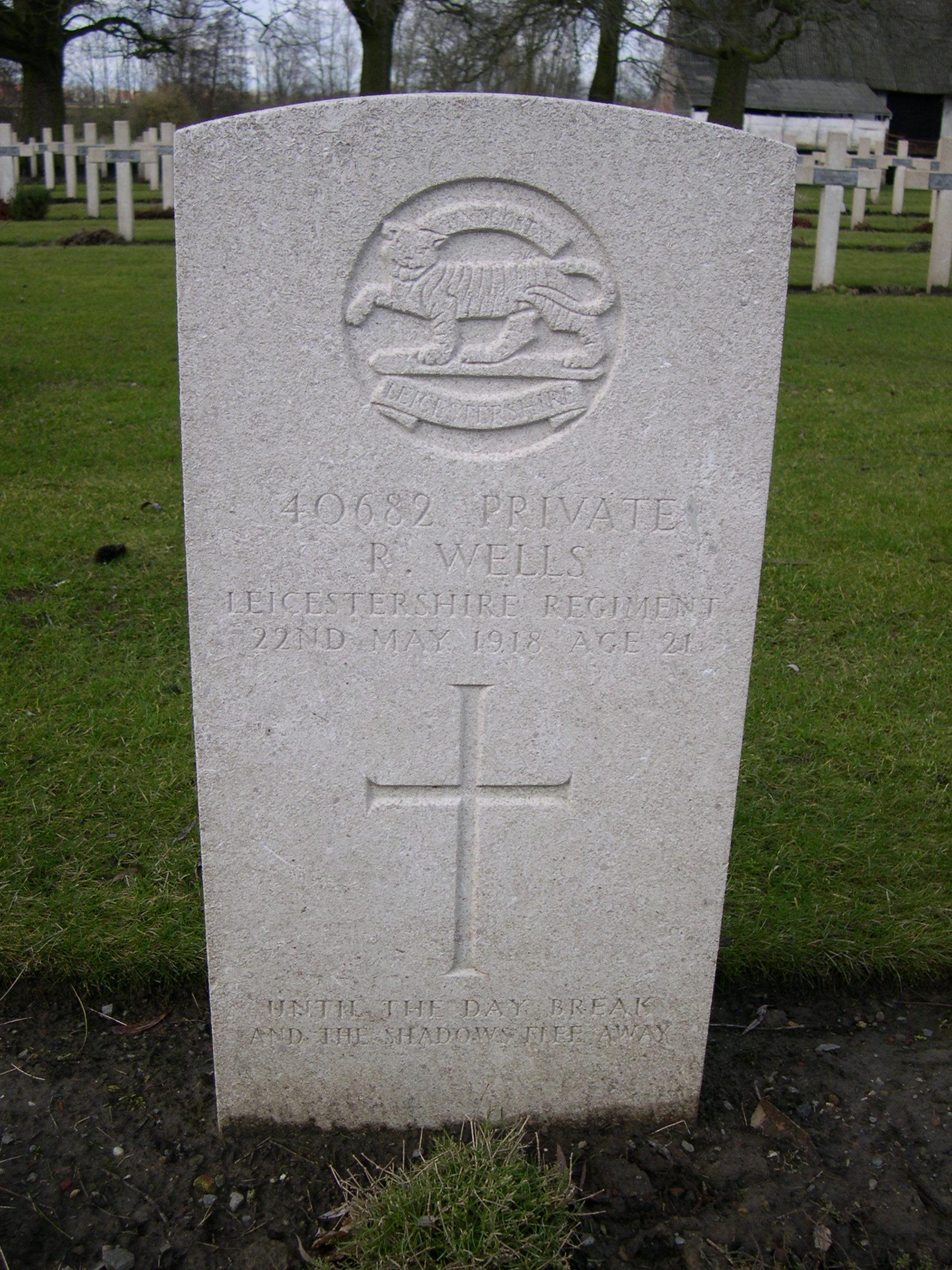 Frederick West, known as 'Fred', was born in Loughborough in 1895 and baptised on 5th January 1897 at All Saints Church, Loughborough. He was the son of Frederick West, a labourer, and his second wife Harriett Asher West (née Wignell) who were married at All Saints Church on 5th August 1895. Fred's father was a labourer who progressed to being a fettler and then an iron moulder for an engineering firm. In 1897 the West family lived at 14 Shakespeare Street, Loughborough. By 1901 they had moved to 58 Russell Street and by 1911 to 112 Russell Street. Fred had two brothers Edward and George and one sister Emma. Another brother Albert had died aged 2. In 1911 Fred, aged 15, was an iron turner at the Empress Works of Herbert Morris Ltd, crane manufacturers. Fred's parents later moved to 93 Russell Street. Fred enlisted in August 1914 and joined the 7th (Service) Battalion of the Leicestershire Regiment as Private 11706. From the depot at Glen Parva Fred was sent to the Salamanca Barracks at Aldershot for training. After being sent to the Andover area in March 1915 the battalion moved to Salisbury Plain in April where on 25th June they were inspected by King George V at Sidbury Hill. On 29th July 1915 they received orders to proceed to France. The 7th Leicesters set sail for France on the SS Onward 'in utter darkness and complete silence'. There was no-one to see off the 110th Brigade as ships leaving full of 'Tommies bound for France' was no longer exciting. In September the 7th Battalion was sent to the area of Berles-au-Bois, south-west of Arras. The battalion remained in this area around Bienvillers and Bailleulmont until April 1916 and was engaged in localised operations seeking a tactical advantage. When not in the trenches being subjected to enemy shelling the 7th Leicesters received intensive training in bombing, Lewis gunnery, visual signalling and a host of other activities. In April 1916 they were moved to the Doullens area and formed working parties to cut down trees and prepare brushwood for the front line as well as preparing the support trenches in the area. In May they worked on building a new railway line between Le Bret and Bienvillers-au-Bois. Towards the end of May the battalion returned to the trenches in the Bienvillers-Bailleulmont area. At the beginning of July the 7th Battalion moved on to the Somme. They were at Fricourt on 13th July and at Mametz Wood and in the attack on Bazentin-le-Petit on 14th July. After the Bazentin Ridge battle the battalion marched away from the Somme and entrained for part of the journey to Hangest. On 6th August they took over a section of battered trenches at Agnez-lès-Duisans, near Arras. After ten days training at Denier and Sars-le-Bois the battalion entrained again for the Somme on 12th September and bivouacked outside Montauban north-east of Bernafay Wood. On 25th September they fought very bravely and successfully at Gueudecourt in an action which was part of the Battle of Morval. On 4th October the battalion entrained once more for the north and the countryside of Loos, taking over positions opposite the Hohenzollern Redoubt with rest billets at Mazingarbe, Philosophe, or Vermelles. Training at Cauchy-à-la-Tour and Houtkerque followed until 12th February 1917. On 13th February the battalion entrained at Proven for Fouquerieul and marched to billets in the tobacco factory in Béthune. Moving on to Labourse they were back in the trenches in the Hohenzollern sector on 15th February, moving up to the front line on 21st February. Breaks from the trenches were taken in Noyelles. In March 1917 the battalion experienced what one soldier called 'the bombardment of our lives'. On 29th March the battalion entrained at Noyelles for Saulty-L'Arbret and marched to La Cauchie and on to Moyenville. On 4th April the battalion went into the front line at St. Leger Croisilles, with breaks at Moyenville. From 15th to 23rd April the battalion was in training at Bailleulval before returning to the trenches at St. Leger Croisilles. On 28th April the battalion was in action at the Battle of Arleux and on 3rd May in reserve for the 2nd Battle of Bullecourt, moving into the front line on 4th May. From 4th -11th May the battalion suffered from very heavy enemy shelling. From 12th-31st May the battalion was withdrawn for training at Bienvillers. Further training and trench tours followed in the Moyenville area in June, July and August, followed by a break in Hamelincourt. On 25th and 26th August the battalion marched to Gouy-en-Artois and then Beaufort for training. After a further move to Hauteville for more training and a football tournament and boxing competition, both of which the 7th Leicesters won, on 16th September the battalion entrained at Savy station for Caestre. Fred, however, was now on two weeks leave. On 23rd September the battalion marched to Berthen. On 26th September they moved by bus to Scottish Wood and then to Bedford House as reserve in the forward area. After two days rest at Micmac Camp, where Fred rejoined them, the battalion was back in the forward area on 29th. The 3rd Battle of Ypres had been raging for two months and the ground was full of water-logged shell holes, which had to be negotiated over duckboards. The 7th Leicesters joined the battle on the night of the 30th September, marching up to Polygon Wood, which had been captured by the Australians. The 9th Leicesters took over positions in the right half of the Polygon sector just outside the wood with the 7th Battalion behind them in support and the 6th Leicesters in reserve. On 1st October the enemy began a heavy barrage. The Leicesters nevertheless pushed forward. Fred West, aged 22, was one of 26 Ordinary Ranks killed in action that day. He was buried in Butts New British Cemetery, next to Polygon Wood, Grave XX1V. B. 10. His mother paid to have the words 'Rest in Peace' engraved on his headstone. In a letter to Fred's parents a chum in the company said that Fred was shot