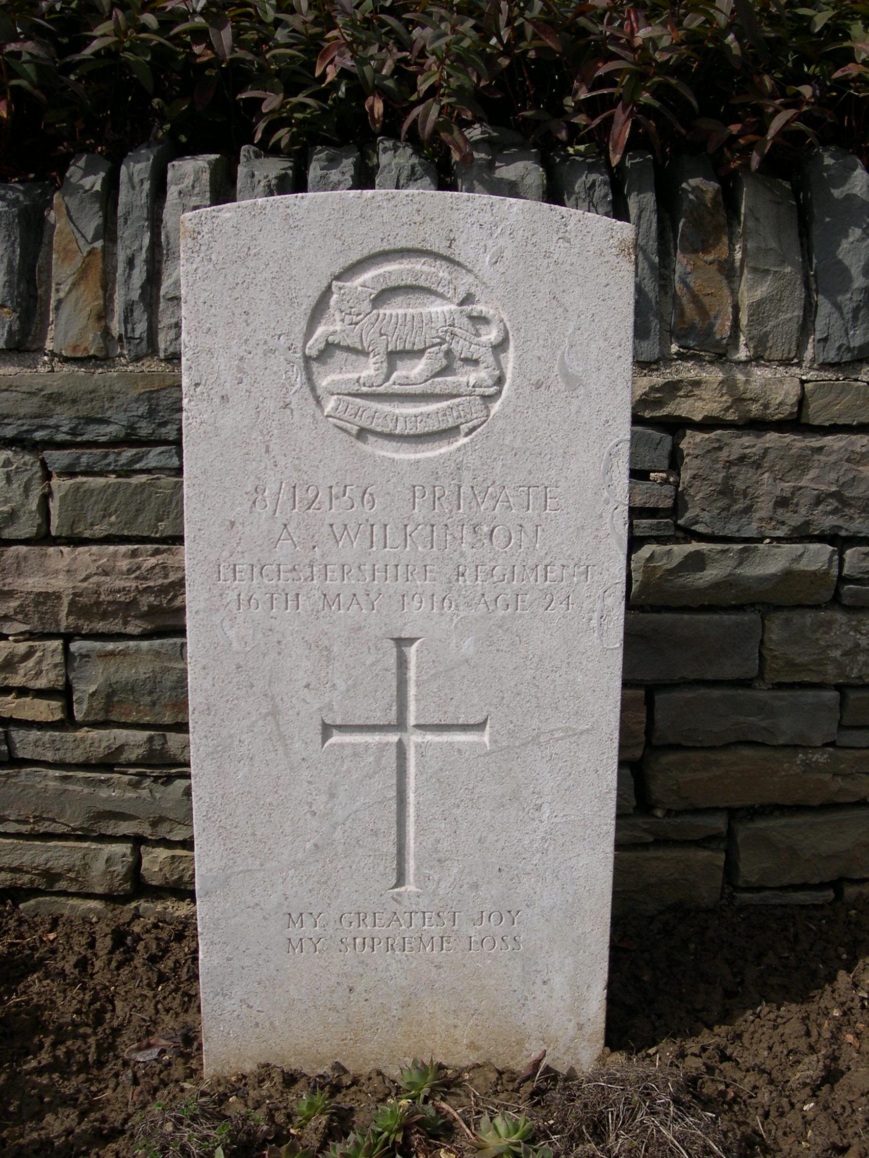 Albert Wilkinson was born in East Norton, Leicestershire, in 1893. He was son and only child of William Wilkinson, a farm labourer, and his wife Harriet (née Carter). His parents were married in the Melton Mowbray area in 1891. Albert's mother sadly died when Albert was two years old and his father's sister Eliza Ann Wilkinson came to look after the household. In 1901 the family home was at Wilsthorpe near Long Eaton and Albert's uncle Jesse Wilkinson had joined them. By 1911 Albert's father and aunt Eliza Ann had moved with Albert to 31 Albert Street, Loughborough. Albert was now working in the Despatch Office of the Empress Works. Albert's father and aunt Eliza Ann later moved to 98 Russell Street. Albert enlisted at Loughborough in 1914 and joined the 8th (Service) Battalion of the Leicestershire Regiment as Private 12156. He was initially sent to Aldershot for training and then to Shorncliffe in Kent at the end of February 1915. In April 1915 Albert's battalion became part of the newly established 37th Division of the Second New Army and the Division began to concentrate on Salisbury Plain. On 25th June the units were inspected by King George V at Sidbury Hill. On 22nd July 1915 the Division began to cross the English Channel and Albert travelled to France on 29th July 1915. The 8th Battalion then moved via Watten, Houlle, St. Omer, Eecke and Dranoutre to Wulverghem and Berles-au-Bois, a short distance from the front line. In the months that followed the 8th Battalion did tours in the trenches, alternating with the 6th Leicesters who relieved them. In April 1916 the 8th Leicesters moved to the Doullens area for six weeks for cleaning up, resting and training. In mid-May the 8th Leicesters returned once more to the trenches in the Bienvillers-Bailleulmont sector. It was here that Albert was killed in action by the explosion of an enemy trench mortar bomb on 16th May 1916, aged 23. He is buried at Bienvillers Military Cemetery, Pas de Calais, Grave I. A. 88. The same bomb also caused the death of Albert's friend and comrade, Private Tom Hudson of Queen's Road, from Hurst's boot shop, Church Gate. Albert and Tom were buried in adjacent graves. Albert's Captain wrote: "He was a universal favourite especially on account of his very fine example, his splendid cheerfulness and courage. I know his sterling worth, for he has been with me since the birth of the battalion, and I have never had the slightest reason to find fault with him. He was a very good soldier indeed, and always ready to volunteer for anything, and had it not been for his diminutive size he would most probably been a sergeant." After the funeral the Chaplain also sent a comforting message which said that Wilkinson, although small in height, was strong and was an expert bomber. He had been at the Empress Works for eight years, and was thoroughly liked by all from the workmen to the management. He was very keen on improving his education. Sergeant J. A. Frake, a Loughborough man, in his letter of condolence said: "He was loved and respected by all". |