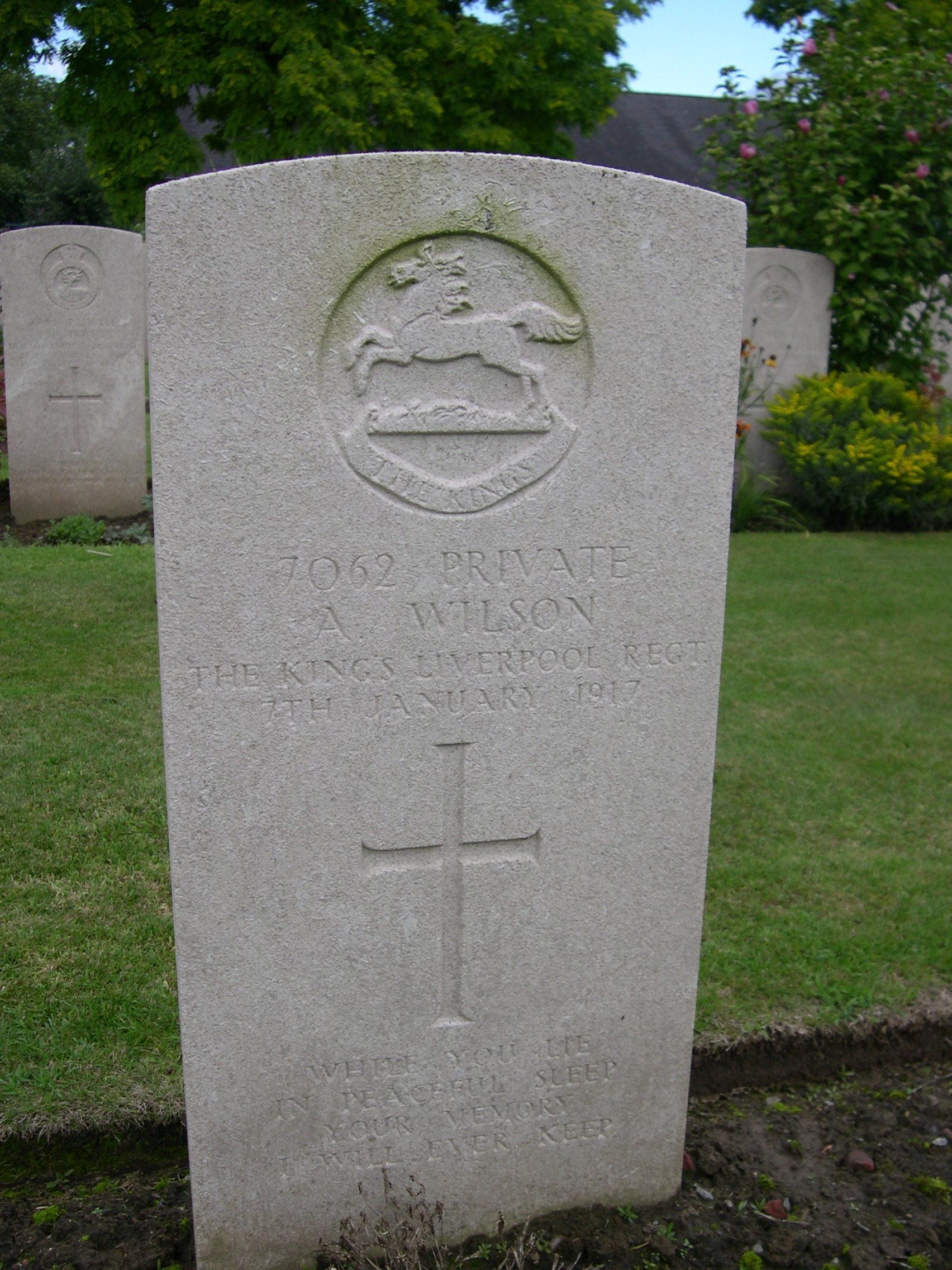 Private 7062 1/10th (Scottish) Bn, The King's (Liverpool Regiment). Later renumbered as 357969 Killed in Action 7th January 1917, Aged 22. Buried Vlamertinghe Military Cemetery V. D. 3.