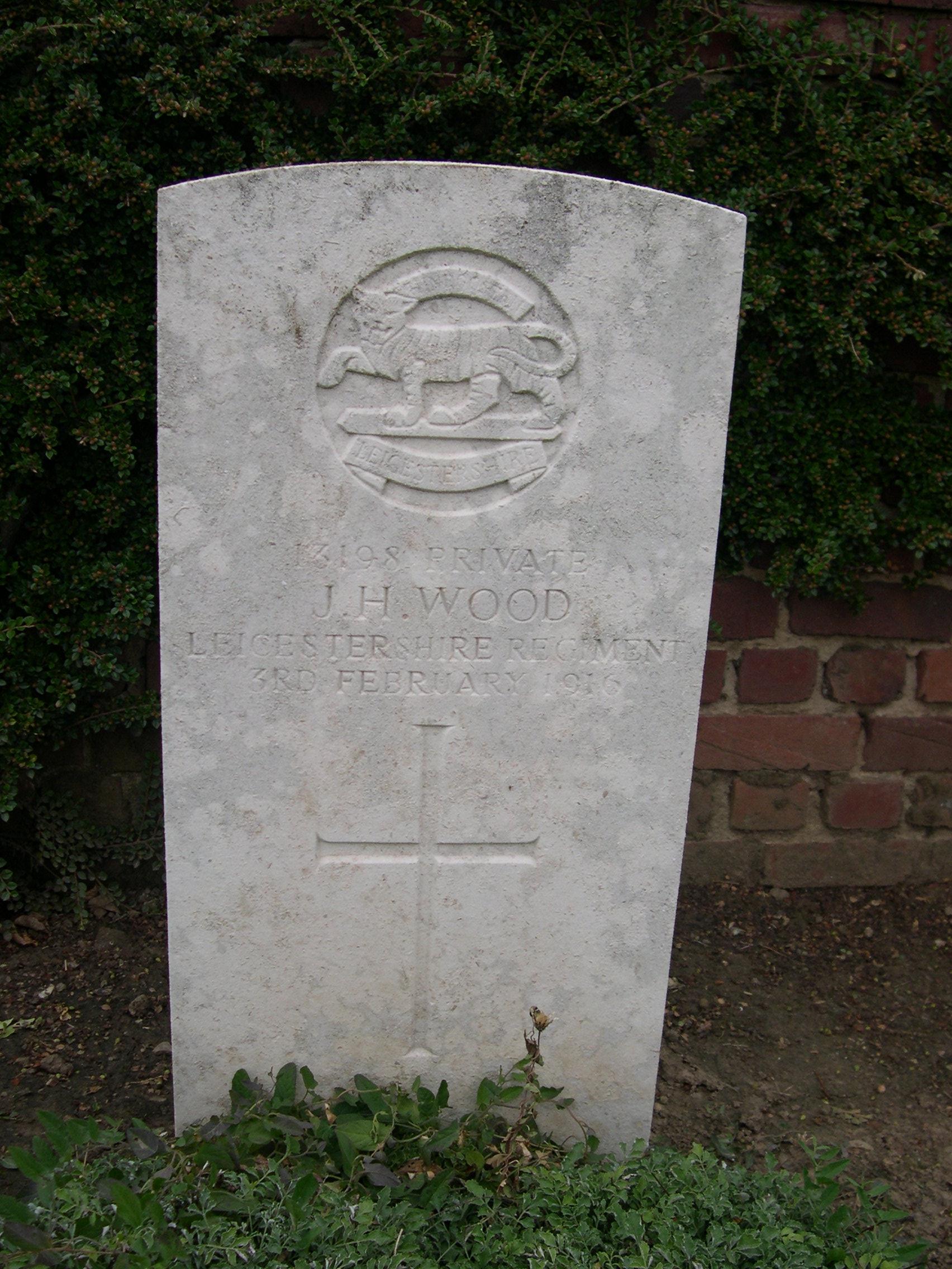 employment as a khaki hand with N.M.C. When war broke out both Joseph and his step-father John William enlisted. Joseph became Private 13198 in the 8th Battalion of the Leicestershire Regiment and his step-father, who had previously served with the volunteers, joined the 3rd Battalion of the same regiment. Joseph's battalion was raised at Leicester as part of Kitchener's Third New Army and joined the 23rd Division as Divisional Troops. The units of the Division began to assemble in Hampshire and in December moved into Aldershot and Ewshott. In February 1915 another move was made to Shorncliffe in Kent. In April 1915 the 8th Battalion transferred to the 37th Division and a Divisional HQ was established at Andover. The troops then concentrated on Salisbury Plain and on 25th June were inspected by King George V at Sidbury Hill. Fred went with his battalion from Folkestone to France on 29th July 1915, where they initially concentrated near Tilques. In January 1916 Joseph's battalion was in the Arras area of the Pas de Calais, clearing out and repairing trenches around Never Ending Street and Nasty Lane while the enemy fired salvoes of high explosives and whizz-bangs at them. Joseph was killed in action while on sentry duty in the village of Berles-au-Bois, where he was billeted, on 3rd February 1916, aged 20. He was hit by a German high explosive shell and when found was still grasping his rifle and bayonet, game to the last. He was buried in Berles-au-Bois Churchyard Extension, Grave B.6, by the Reverend S. Magor, Wesleyan chaplain attached to the 9th Leicesters. By 1919 the Wood family had moved to 11 Gordon Street, Loughborough. After the war ended Joseph's half-brother John enlisted with the Leicestershire Regiment, transferring to the Sherwood Foresters, and his half-brother Edward enlisted with the North Staffordshire Regiment, transferring to the Leicestershire Regiment. |