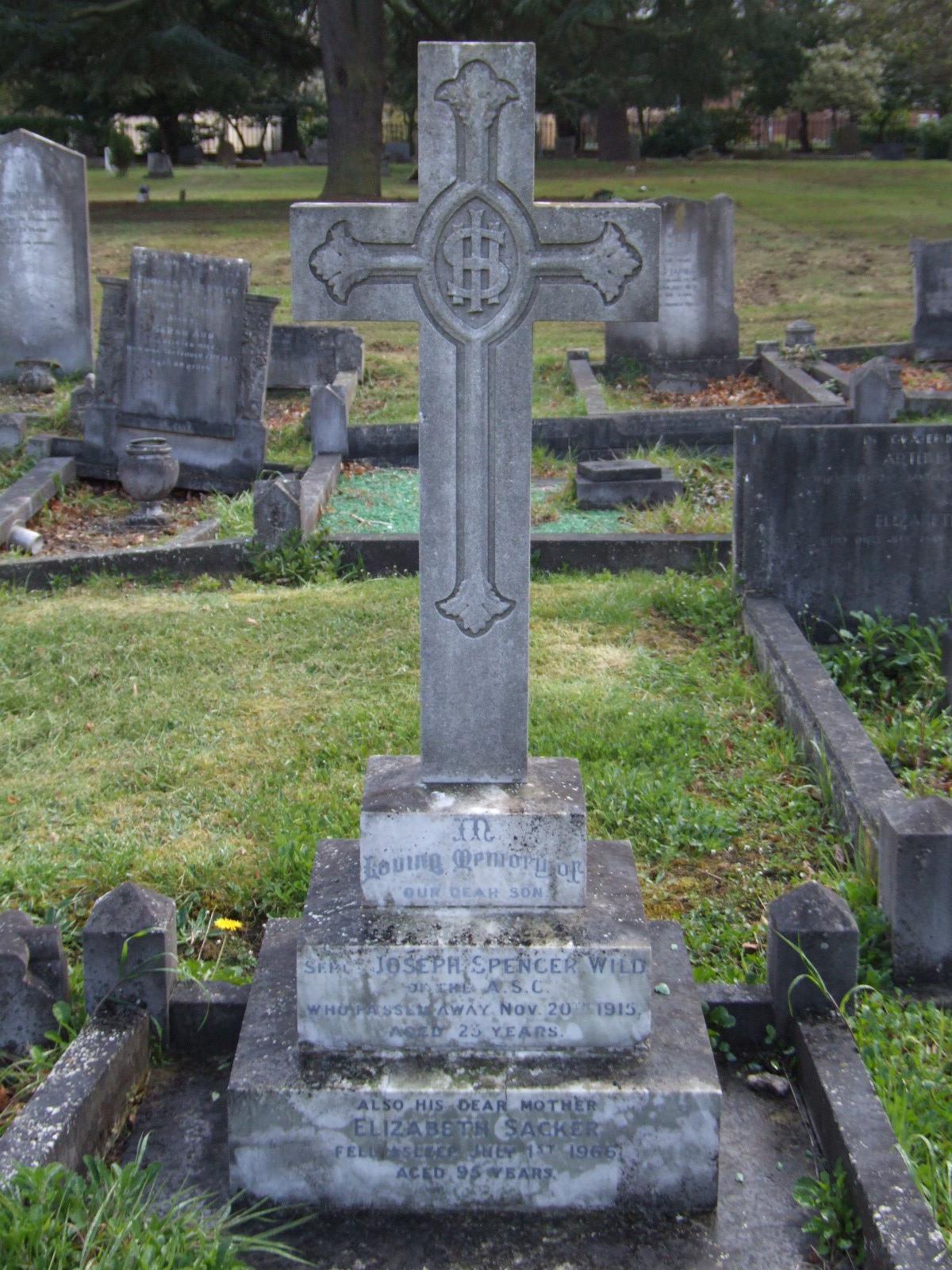Joseph Spencer Wild, known as 'Joe', was born in Bury, Lancashire, in 1892, the son of Joseph Wild, a pork butcher, and Elizabeth Spencer Wild (née Mills). Joe's parents were married at Christchurch, Walmersley, Lancashire in 1890 and a year later were living at 357 Walmersley Road, Bury. Joe had a twin sister Florrie and an older brother Harry. What became of Joe's father is unknown but in 1900 his mother was remarried to John Whitworth Sacker, a widowed iron founder from Bury who had a young daughter Edith. By 1901 the family had moved to 69 Burder Street, Loughborough. In 1911 Joe was employed as a law clerk and the family were living at 14 Boyer Street. Joe's parents later moved to 39 Hudson Street. Joe enlisted as Private S4/085948 with the Royal Army Service Corps and served with Supply. He was promoted to Acting Corporal and then to Sergeant. He died of pneumonia on 20th November 1915, aged 23 and is buried in Loughborough Cemetery Grave 9/226. His funeral was reported as follows: 'Military honours were paid at the funeral, at Loughborough Cemetery, of Sergeant Joseph Spencer Wild, of the Army Service Corps. Deceased was the son of Mrs. Sacker and the late Mr. J.Wild, of 39 Hudson Street, Loughborough, and was 23 years of age. Before he enlisted he was in a good position in Leicester, and had previously done well at Loughborough Technical Institute, where he was a great favourite among the students. He had an illness while in camp at Aldershot, and came home on sick leave early, but very soon after severe pneumonia developed, and for several days he was unconscious, and died on Saturday. The mourners were: Mr. and Mrs. J. W. Sacker (step-father and mother), Mrs. F. James (sister), Mr. E. James (brother-in-law), Mr. and Mrs. T. Ward (cousins), Miss Rivington, and Mrs. Rivington. Mr. H. Miller and Miss Hart represented the office staff of Messrs, J. Marsh Ltd, (Leicester), where deceased was employed before joining the Army, and Mr. J. A. Martin (tutor) and Mr. H. H. Carpendale represented the advanced shorthand class at the Loughborough Technical Institute. The bearers were five sergeants and four corporals of the A.S.C. from Aldershot, under the command of Sergeant Major Ferris. The firing and bugle parties were from the Depot of the 17th Leicestershire Regiment at Glen Parva, and were under the command of Sergeant Manship. The coffin was covered by the Union Jack; on which was the late sergeant's headgear and belt. The Rev. F. W. Gostick and H. Hartley conducted the service, and after three volleys had been fired over the grave the "Last Post" was sounded. Wreaths were sent by the family, and floral tributes were also presented by his fellow clerks at Messrs, J. Marsh, Ltd, (Leicester), the clerical staff of the Labour Depot, A.S.C. Aldershot, and Mr. J. A. Martin and his shorthand friends.' |